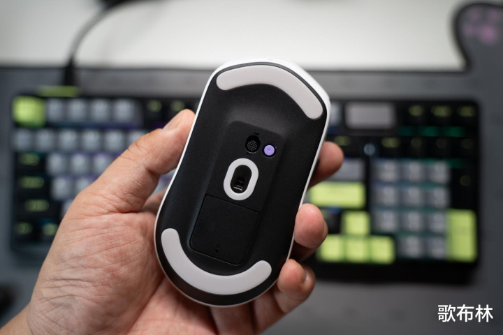 将鼠标翻转过来,可以看到最核心的传感器居于中心位置,让你无论抓握哪个部位,光标都能精准跟随。上中下三块细长脚贴的布局似乎是近期高端鼠标行列里比较流行的配置方案,它就像为鼠标装上了滑轨,快速甩动时也能保持顺滑平稳。特别实用的是,传感器上方设有一个功能按键,下方则隐藏着2.4G接收器的“家”,再也不用担心小巧的接收器会丢失。最惊喜的是,底部还支持更换无线充电模块,让鼠标真正实现“放下去就充电”的无感体验。